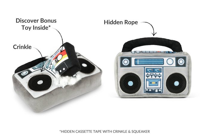 Rock the dog park with P.L.A.Y.’s 80s Classics Boop-Box toy! This rad toy features a bonus squeaky cassette tape with crinkle for extra excitement and a hidden rope to create a rugged handle for interactive play. Watch your furry friend jam out to their favorite beat, where every play session is a canine dance party! •Hand-made craftsmanship, double layer exterior and reinforced stitching for extra durability •Eco-friendly PlanetFill® filler is made from 100% post-consumer certified-safe recycled plastic bottles •Machine washable and dryer friendly •Features AZO-free dyes •All of our toys meet the same strict quality standards for manufacturing infant and children products. Meet requirements for EN71 – Part 1, 2, 3 & 9 (EU), ASTM F963 (US) toy safety standards and REACH – SVHC